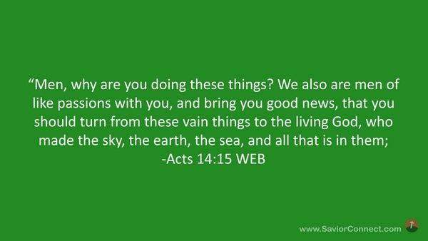“Men, why are you doing these things? We also are men of like passions with you, and bring you good news, that you should turn from these vain things to the living God, who made the sky, the earth, the sea, and all that is in them; -Acts 14:15 WEB