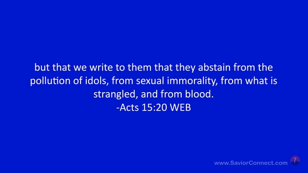 but that we write to them that they abstain from the pollution of idols, from sexual immorality, from what is strangled, and from blood. -Acts 15:20 WEB