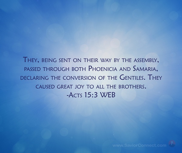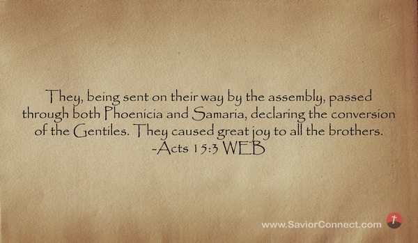 They, being sent on their way by the assembly, passed through both Phoenicia and Samaria, declaring the conversion of the Gentiles. They caused great joy to all the brothers. -Acts 15:3 WEB