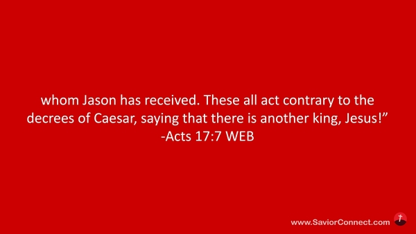 whom Jason has received. These all act contrary to the decrees of Caesar, saying that there is another king, Jesus!” -Acts 17:7 WEB