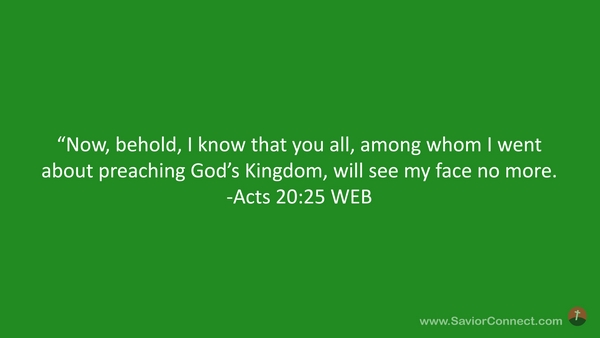 “Now, behold, I know that you all, among whom I went about preaching God’s Kingdom, will see my face no more. -Acts 20:25 WEB