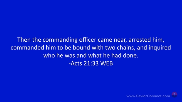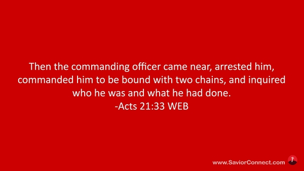 Then the commanding officer came near, arrested him, commanded him to be bound with two chains, and inquired who he was and what he had done. -Acts 21:33 WEB
