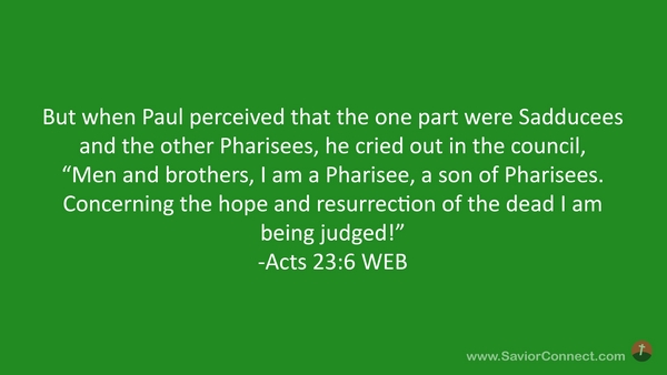 But when Paul perceived that the one part were Sadducees and the other Pharisees, he cried out in the council, “Men and brothers, I am a Pharisee, a son of Pharisees. Concerning the hope and resurrection of the dead I am being judged!” -Acts 23:6 WEB