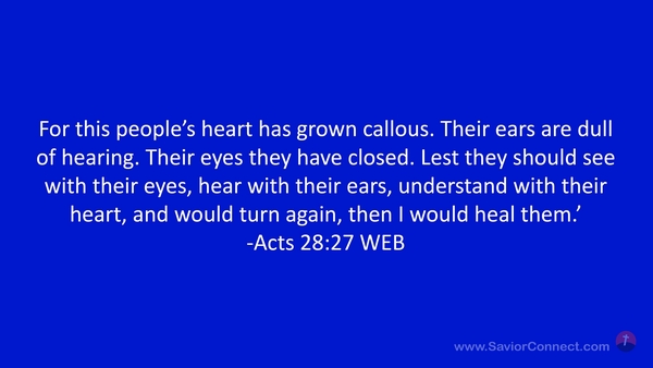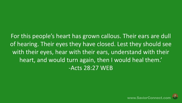 For this people’s heart has grown callous. Their ears are dull of hearing. Their eyes they have closed. Lest they should see with their eyes, hear with their ears, understand with their heart, and would turn again, then I would heal them.’ -Acts 28:27 WEB