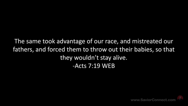The same took advantage of our race, and mistreated our fathers, and forced them to throw out their babies, so that they wouldn’t stay alive. -Acts 7:19 WEB