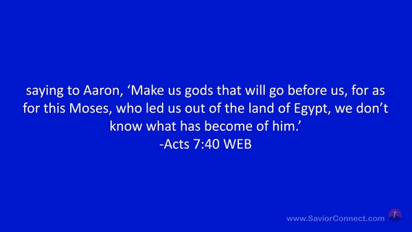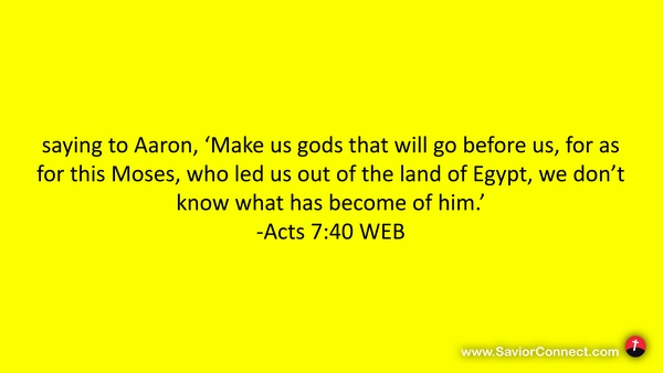 saying to Aaron, 'Make us gods that will go before us, for as for this Moses, who led us out of the land of Egypt, we don’t know what has become of him.’ -Acts 7:40 WEB