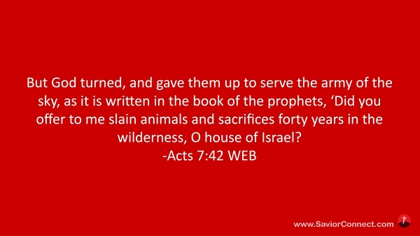 But God turned, and gave them up to serve the army of the sky, as it is written in the book of the prophets, 'Did you offer to me slain animals and sacrifices forty years in the wilderness, O house of Israel? -Acts 7:42 WEB