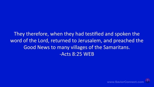 They therefore, when they had testified and spoken the word of the Lord, returned to Jerusalem, and preached the Good News to many villages of the Samaritans. -Acts 8:25 WEB