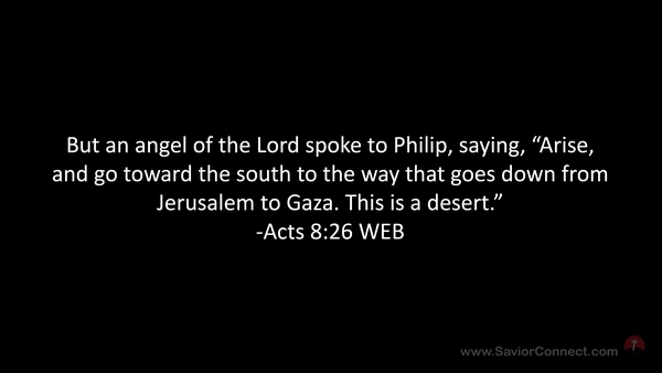 But an angel of the Lord spoke to Philip, saying, “Arise, and go toward the south to the way that goes down from Jerusalem to Gaza. This is a desert.” -Acts 8:26 WEB