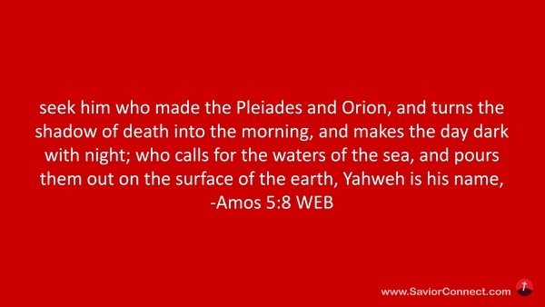 seek him who made the Pleiades and Orion, and turns the shadow of death into the morning, and makes the day dark with night; who calls for the waters of the sea, and pours them out on the surface of the earth, Yahweh is his name, -Amos 5:8 WEB