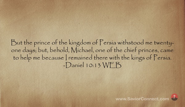 But the prince of the kingdom of Persia withstood me twenty-one days; but, behold, Michael, one of the chief princes, came to help me because I remained there with the kings of Persia. -Daniel 10:13 WEB