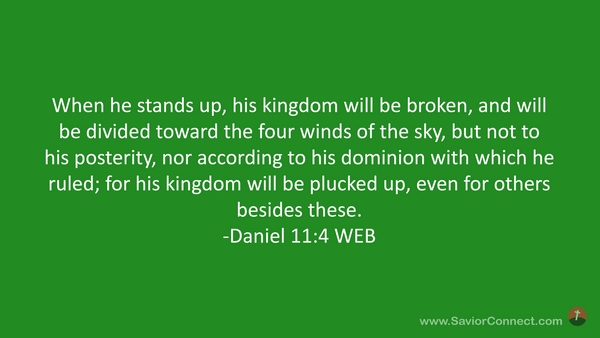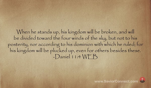 When he stands up, his kingdom will be broken, and will be divided toward the four winds of the sky, but not to his posterity, nor according to his dominion with which he ruled; for his kingdom will be plucked up, even for others besides these. -Daniel 11:4 WEB