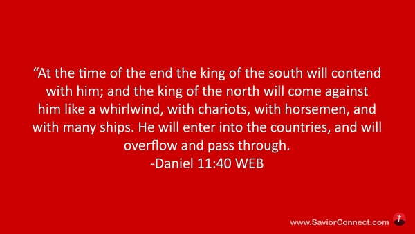 “At the time of the end the king of the south will contend with him; and the king of the north will come against him like a whirlwind, with chariots, with horsemen, and with many ships. He will enter into the countries, and will overflow and pass through. -Daniel 11:40 WEB