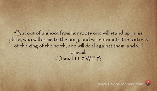 “But out of a shoot from her roots one will stand up in his place, who will come to the army, and will enter into the fortress of the king of the north, and will deal against them, and will prevail. -Daniel 11:7 WEB