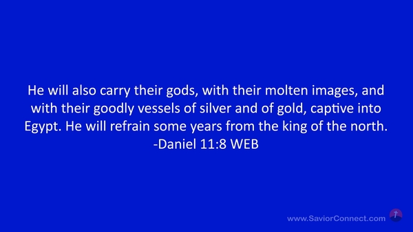 He will also carry their gods, with their molten images, and with their goodly vessels of silver and of gold, captive into Egypt. He will refrain some years from the king of the north. -Daniel 11:8 WEB