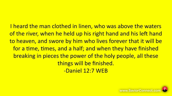 I heard the man clothed in linen, who was above the waters of the river, when he held up his right hand and his left hand to heaven, and swore by him who lives forever that it will be for a time, times, and a half; and when they have finished breaking in pieces the power of the holy people, all these things will be finished. -Daniel 12:7 WEB