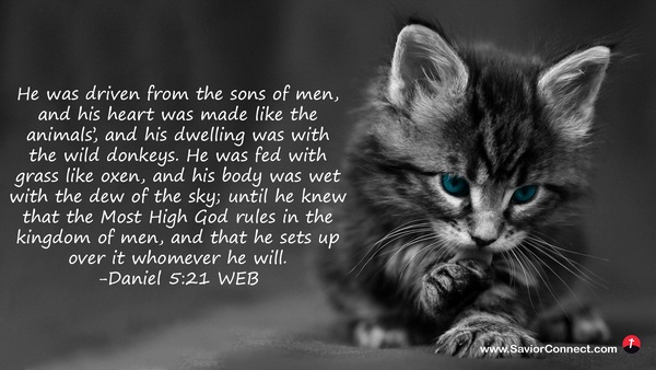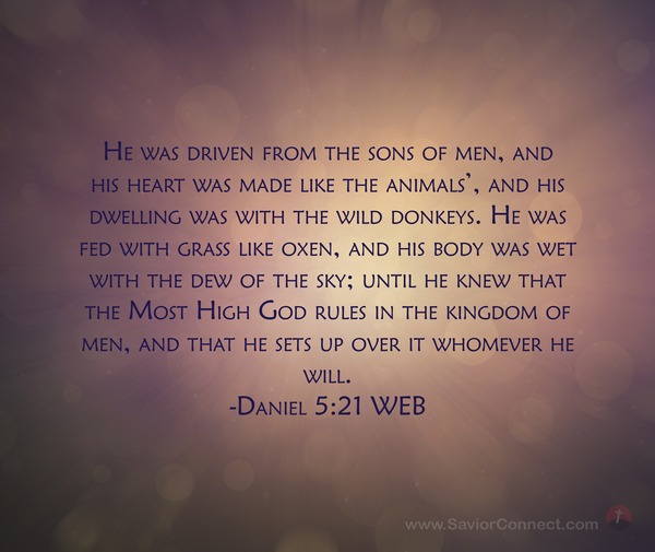 He was driven from the sons of men, and his heart was made like the animals’, and his dwelling was with the wild donkeys. He was fed with grass like oxen, and his body was wet with the dew of the sky; until he knew that the Most High God rules in the kingdom of men, and that he sets up over it whomever he will. -Daniel 5:21 WEB