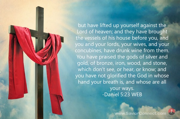 but have lifted up yourself against the Lord of heaven; and they have brought the vessels of his house before you, and you and your lords, your wives, and your concubines, have drunk wine from them. You have praised the gods of silver and gold, of bronze, iron, wood, and stone, which don’t see, or hear, or know; and you have not glorified the God in whose hand your breath is, and whose are all your ways. -Daniel 5:23 WEB
