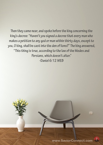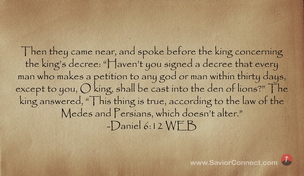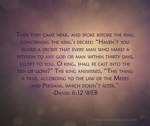 Then they came near, and spoke before the king concerning the king’s decree: “Haven’t you signed a decree that every man who makes a petition to any god or man within thirty days, except to you, O king, shall be cast into the den of lions?” The king answered, “This thing is true, according to the law of the Medes and Persians, which doesn’t alter.” -Daniel 6:12 WEB