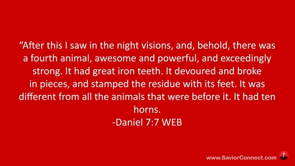 “After this I saw in the night visions, and, behold, there was a fourth animal, awesome and powerful, and exceedingly strong. It had great iron teeth. It devoured and broke in pieces, and stamped the residue with its feet. It was different from all the animals that were before it. It had ten horns. -Daniel 7:7 WEB