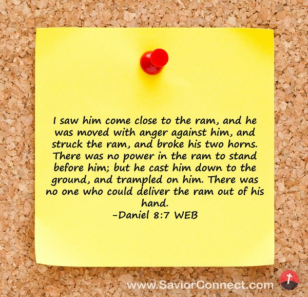 I saw him come close to the ram, and he was moved with anger against him, and struck the ram, and broke his two horns. There was no power in the ram to stand before him; but he cast him down to the ground, and trampled on him. There was no one who could deliver the ram out of his hand. -Daniel 8:7 WEB