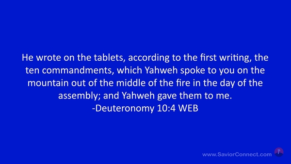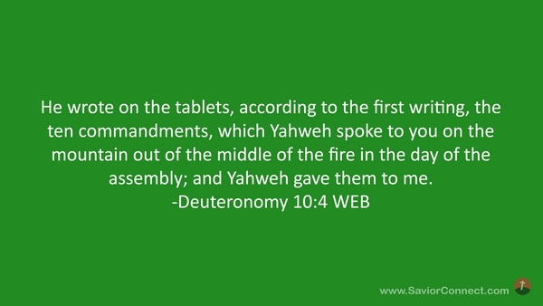 He wrote on the tablets, according to the first writing, the ten commandments, which Yahweh spoke to you on the mountain out of the middle of the fire in the day of the assembly; and Yahweh gave them to me. -Deuteronomy 10:4 WEB