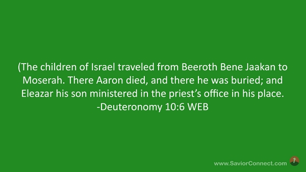 (The children of Israel traveled from Beeroth Bene Jaakan to Moserah. There Aaron died, and there he was buried; and Eleazar his son ministered in the priest’s office in his place. -Deuteronomy 10:6 WEB