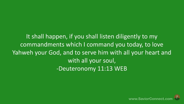 It shall happen, if you shall listen diligently to my commandments which I command you today, to love Yahweh your God, and to serve him with all your heart and with all your soul, -Deuteronomy 11:13 WEB