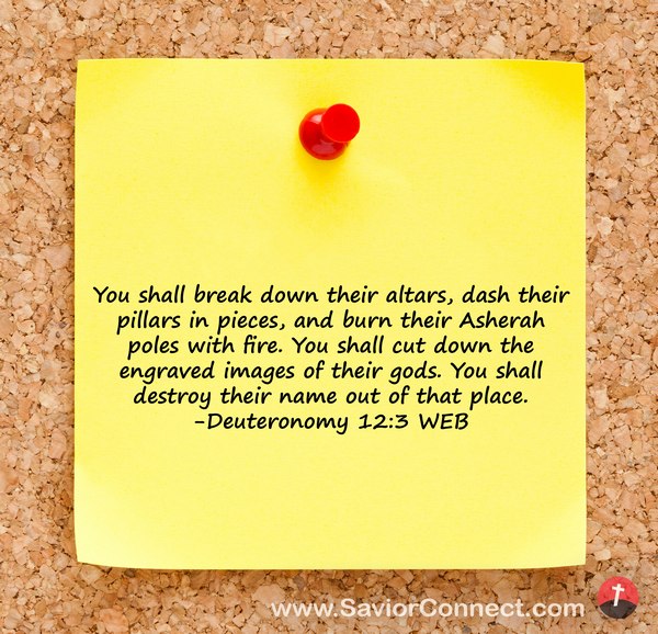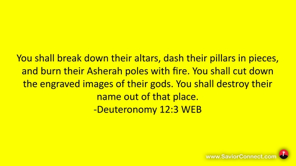 You shall break down their altars, dash their pillars in pieces, and burn their Asherah poles with fire. You shall cut down the engraved images of their gods. You shall destroy their name out of that place. -Deuteronomy 12:3 WEB