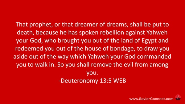 That prophet, or that dreamer of dreams, shall be put to death, because he has spoken rebellion against Yahweh your God, who brought you out of the land of Egypt and redeemed you out of the house of bondage, to draw you aside out of the way which Yahweh your God commanded you to walk in. So you shall remove the evil from among you. -Deuteronomy 13:5 WEB