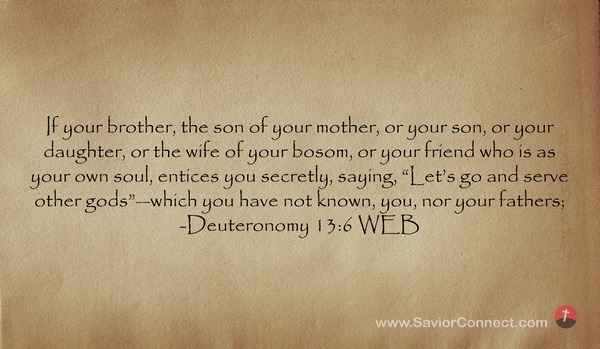 If your brother, the son of your mother, or your son, or your daughter, or the wife of your bosom, or your friend who is as your own soul, entices you secretly, saying, “Let’s go and serve other gods”—which you have not known, you, nor your fathers; -Deuteronomy 13:6 WEB