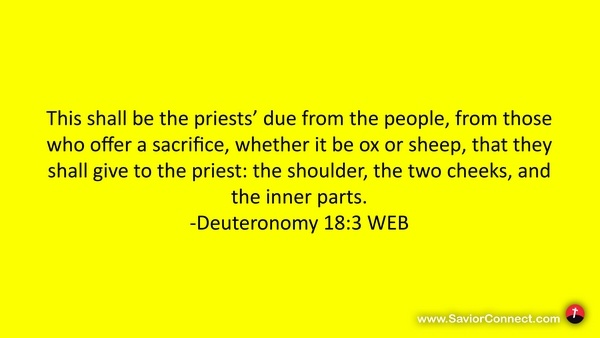 This shall be the priests’ due from the people, from those who offer a sacrifice, whether it be ox or sheep, that they shall give to the priest: the shoulder, the two cheeks, and the inner parts. -Deuteronomy 18:3 WEB