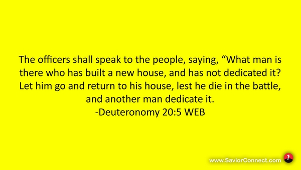 The officers shall speak to the people, saying, “What man is there who has built a new house, and has not dedicated it? Let him go and return to his house, lest he die in the battle, and another man dedicate it. -Deuteronomy 20:5 WEB