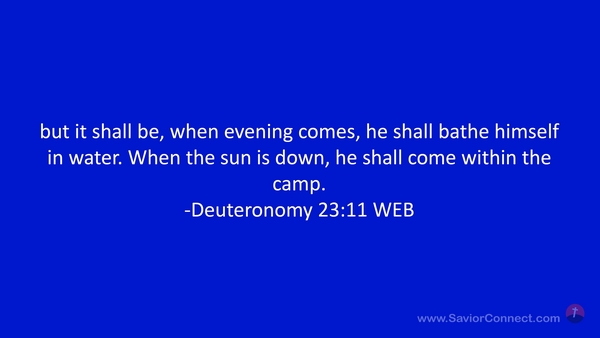 but it shall be, when evening comes, he shall bathe himself in water. When the sun is down, he shall come within the camp. -Deuteronomy 23:11 WEB
