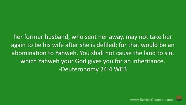 her former husband, who sent her away, may not take her again to be his wife after she is defiled; for that would be an abomination to Yahweh. You shall not cause the land to sin, which Yahweh your God gives you for an inheritance. -Deuteronomy 24:4 WEB