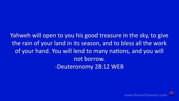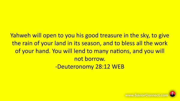 Yahweh will open to you his good treasure in the sky, to give the rain of your land in its season, and to bless all the work of your hand. You will lend to many nations, and you will not borrow. -Deuteronomy 28:12 WEB