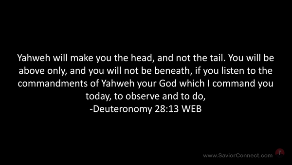 Yahweh will make you the head, and not the tail. You will be above only, and you will not be beneath, if you listen to the commandments of Yahweh your God which I command you today, to observe and to do, -Deuteronomy 28:13 WEB