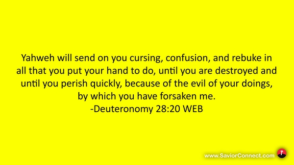 Yahweh will send on you cursing, confusion, and rebuke in all that you put your hand to do, until you are destroyed and until you perish quickly, because of the evil of your doings, by which you have forsaken me. -Deuteronomy 28:20 WEB