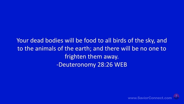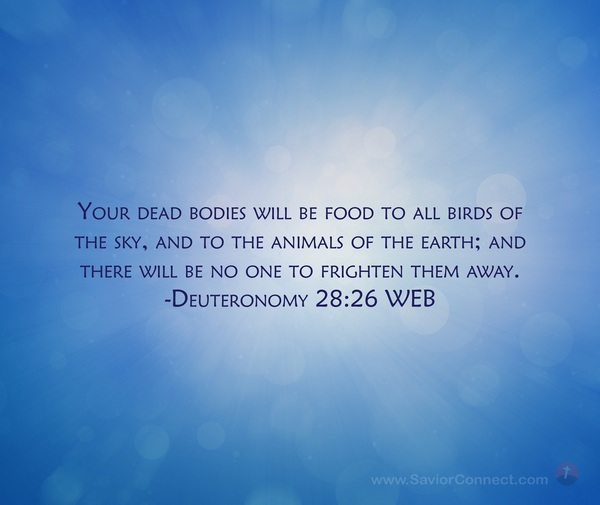 Your dead bodies will be food to all birds of the sky, and to the animals of the earth; and there will be no one to frighten them away. -Deuteronomy 28:26 WEB
