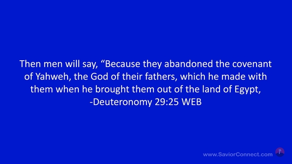 Then men will say, “Because they abandoned the covenant of Yahweh, the God of their fathers, which he made with them when he brought them out of the land of Egypt, -Deuteronomy 29:25 WEB