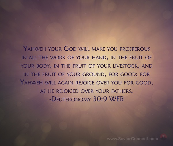 Yahweh your God will make you prosperous in all the work of your hand, in the fruit of your body, in the fruit of your livestock, and in the fruit of your ground, for good; for Yahweh will again rejoice over you for good, as he rejoiced over your fathers, -Deuteronomy 30:9 WEB