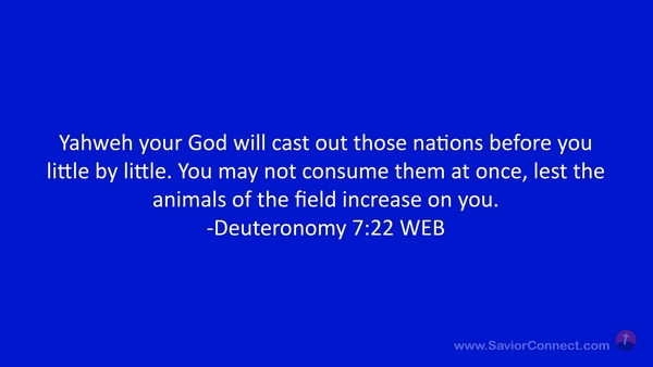 Yahweh your God will cast out those nations before you little by little. You may not consume them at once, lest the animals of the field increase on you. -Deuteronomy 7:22 WEB