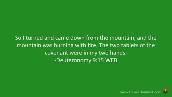 So I turned and came down from the mountain, and the mountain was burning with fire. The two tablets of the covenant were in my two hands. -Deuteronomy 9:15 WEB