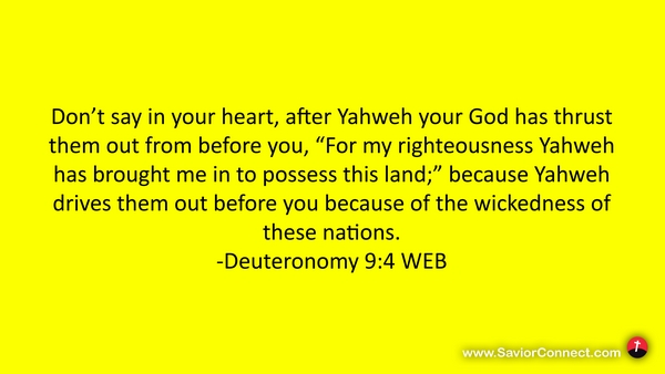 Don’t say in your heart, after Yahweh your God has thrust them out from before you, “For my righteousness Yahweh has brought me in to possess this land;” because Yahweh drives them out before you because of the wickedness of these nations. -Deuteronomy 9:4 WEB