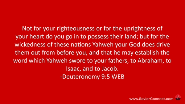Not for your righteousness or for the uprightness of your heart do you go in to possess their land; but for the wickedness of these nations Yahweh your God does drive them out from before you, and that he may establish the word which Yahweh swore to your fathers, to Abraham, to Isaac, and to Jacob. -Deuteronomy 9:5 WEB