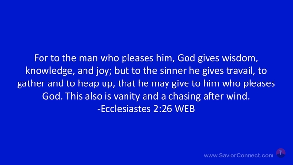 For to the man who pleases him, God gives wisdom, knowledge, and joy; but to the sinner he gives travail, to gather and to heap up, that he may give to him who pleases God. This also is vanity and a chasing after wind. -Ecclesiastes 2:26 WEB