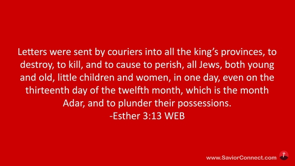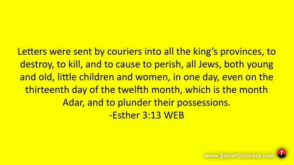 Letters were sent by couriers into all the king’s provinces, to destroy, to kill, and to cause to perish, all Jews, both young and old, little children and women, in one day, even on the thirteenth day of the twelfth month, which is the month Adar, and to plunder their possessions. -Esther 3:13 WEB