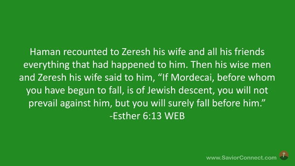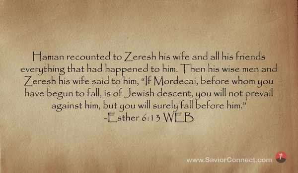 Haman recounted to Zeresh his wife and all his friends everything that had happened to him. Then his wise men and Zeresh his wife said to him, “If Mordecai, before whom you have begun to fall, is of Jewish descent, you will not prevail against him, but you will surely fall before him.” -Esther 6:13 WEB