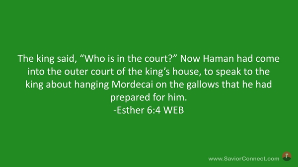 The king said, “Who is in the court?” Now Haman had come into the outer court of the king’s house, to speak to the king about hanging Mordecai on the gallows that he had prepared for him. -Esther 6:4 WEB