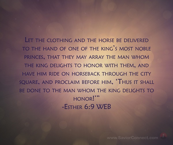 Let the clothing and the horse be delivered to the hand of one of the king’s most noble princes, that they may array the man whom the king delights to honor with them, and have him ride on horseback through the city square, and proclaim before him, 'Thus it shall be done to the man whom the king delights to honor!’” -Esther 6:9 WEB